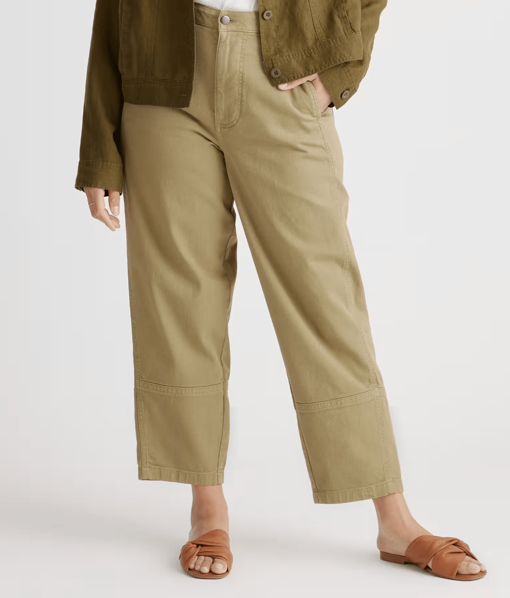 Quince’s Organic Stretch Cotton Twill Barrel Pants are the “I want shape, but I also want to breathe” pick. The listing describes a high rise, relaxed leg, tapered ankle, and functional pockets, made with 97% organic cotton and 3% spandex.